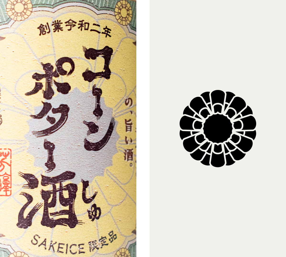 浅草初のCraft SAKE醸造所、木花乃醸造所とSAKEICEコラボ商品「コーンポター酒」のラベルデザインを制作しました。とうもろこしを使ったどぶろくをコーンポター酒と名付けた商品です。あえて伝統と歴史を感じさせるデザインにすることで、「創業令和二年」が強烈な違和感を出すというアイデアを採用いただきました。コーンの断面を家紋のように見せたり、日に焼けて色褪せたような色味に調整したりするなど、「昔ながらの日本酒ラベル」に見せる工夫を凝らしています。